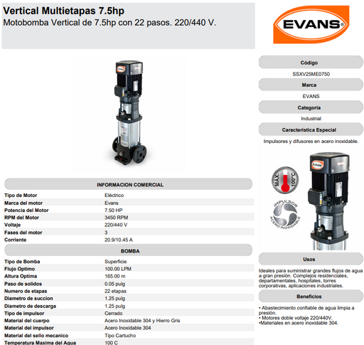 EVANSPrecio original $ 35,803.00 - Precio original $ 35,803.00Precio original$ 35,803.00$ 35,803.00 - $ 35,803.00Precio actual $ 35,803.00| /BOMBA MULTIETAPAS VERTICAL MARCA EVANS MODELO SSXV25ME0750, PARA ALTA PRESIÓN, CON 22 ETAPAS. SUCCIÓN Y DESCARGA DE 1.25". MOTOR: 7.5 HP VOLTAJE: 2...