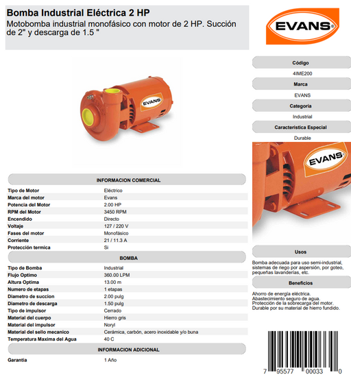 EVANSPrecio original $ 9,443.00 - Precio original $ 9,443.00Precio original$ 9,443.00$ 9,443.00 - $ 9,443.00Precio actual $ 9,443.00| /Bomba centrífuga marca EVANS modelo 4IME200, con succión y descarga de 2" x 1 1/2". Para uso agrícola o industrial Motor: 2 HP Voltaje: 110/220v F...