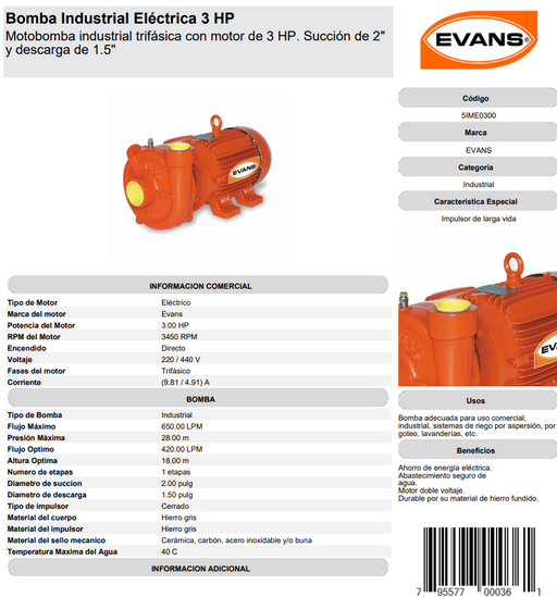 EVANSPrecio original $ 21,819.00 - Precio original $ 21,819.00Precio original$ 21,819.00$ 21,819.00 - $ 21,819.00Precio actual $ 21,819.00| /Bomba centrífuga marca EVANS modelo 5IME0300, con succión y descarga de 2" x 1 1/2". Para uso agrícola o industrial Motor: 3 HP Voltaje: 220/440V ...